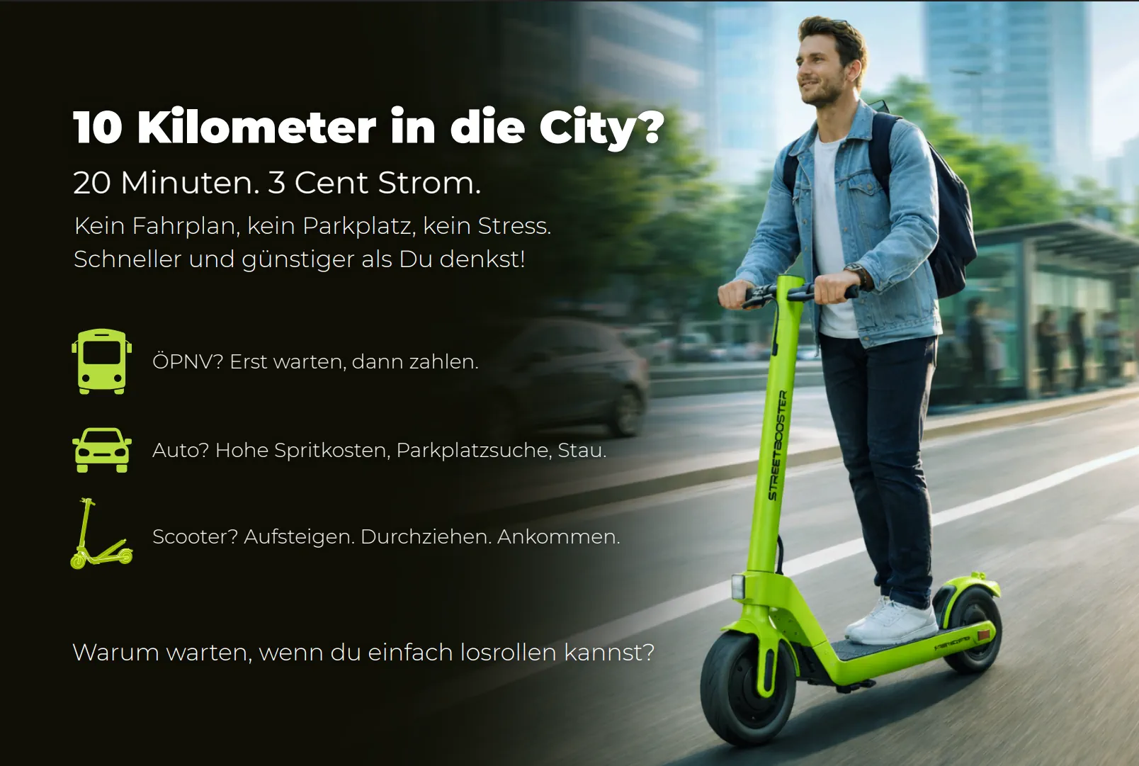 STREETBOOSTER rappresenta monopattini elettrici di alta qualità E-Scooter, che uniscono il massimo divertimento di guida a una tecnologia intelligente. Con un innovativo sistema di batteria intercambiabile, omologazione stradale e un servizio di prima classe, STREETBOOSTER stabilisce nuovi standard nella mobilità urbana.